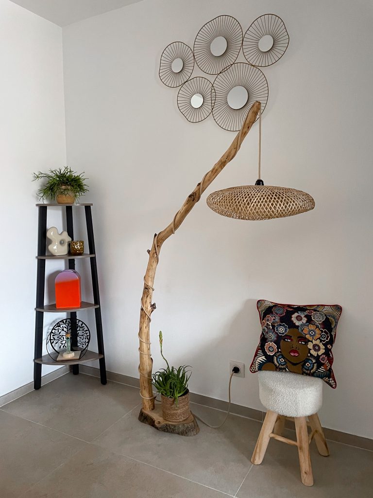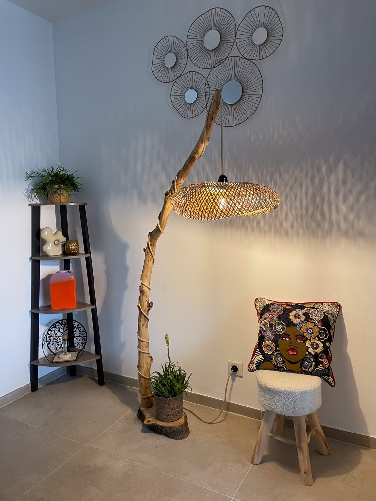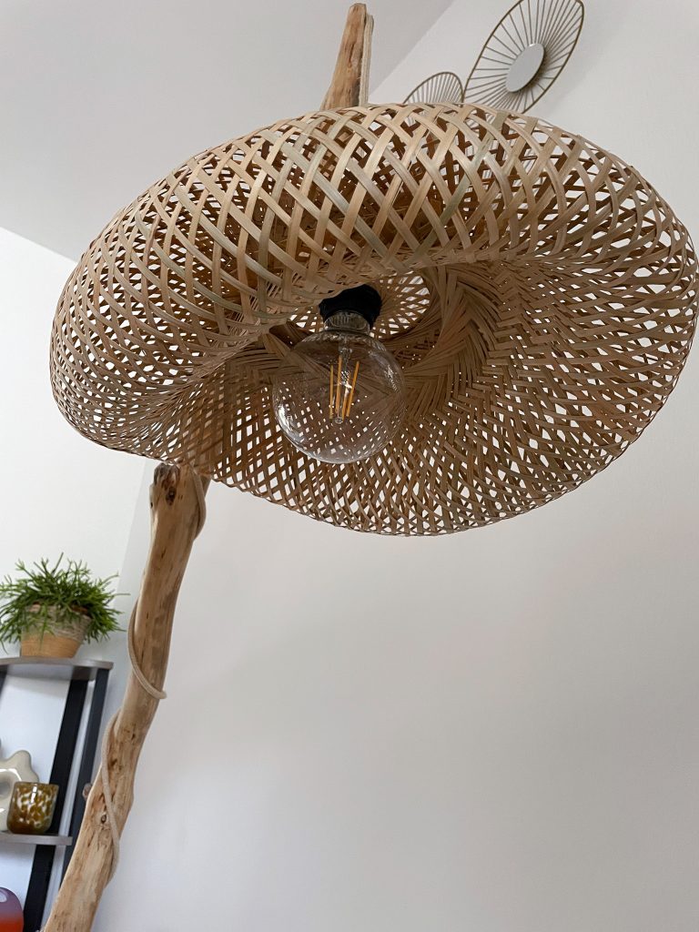 • L’abat-jour en rotin tressé, diffuse une lumière douce et chaleureuse